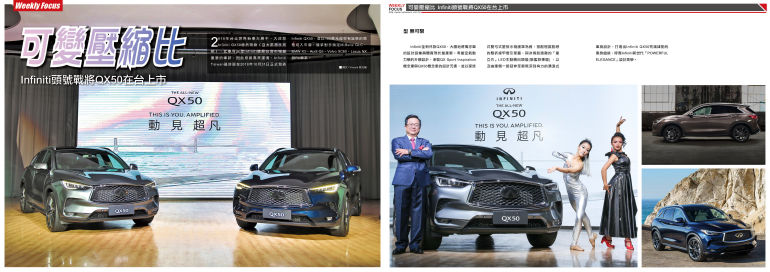 2018年台北世界新車大展中,大改款Infiniti QX50赫然現身(亞太區首度亮相),此車可說是Infiniti擴展台灣市場最重要的車款,因此原廠異常謹慎,Infiniti Taiwan最終選在2018年10月31日正式發表Infiniti QX50,並以188萬元起很有誠意的價格切入市場,競爭對手鎖定M-Benz GLC、BMW X3、Audi Q5、Volvo XC60、Lexus NX與RX車系。.....